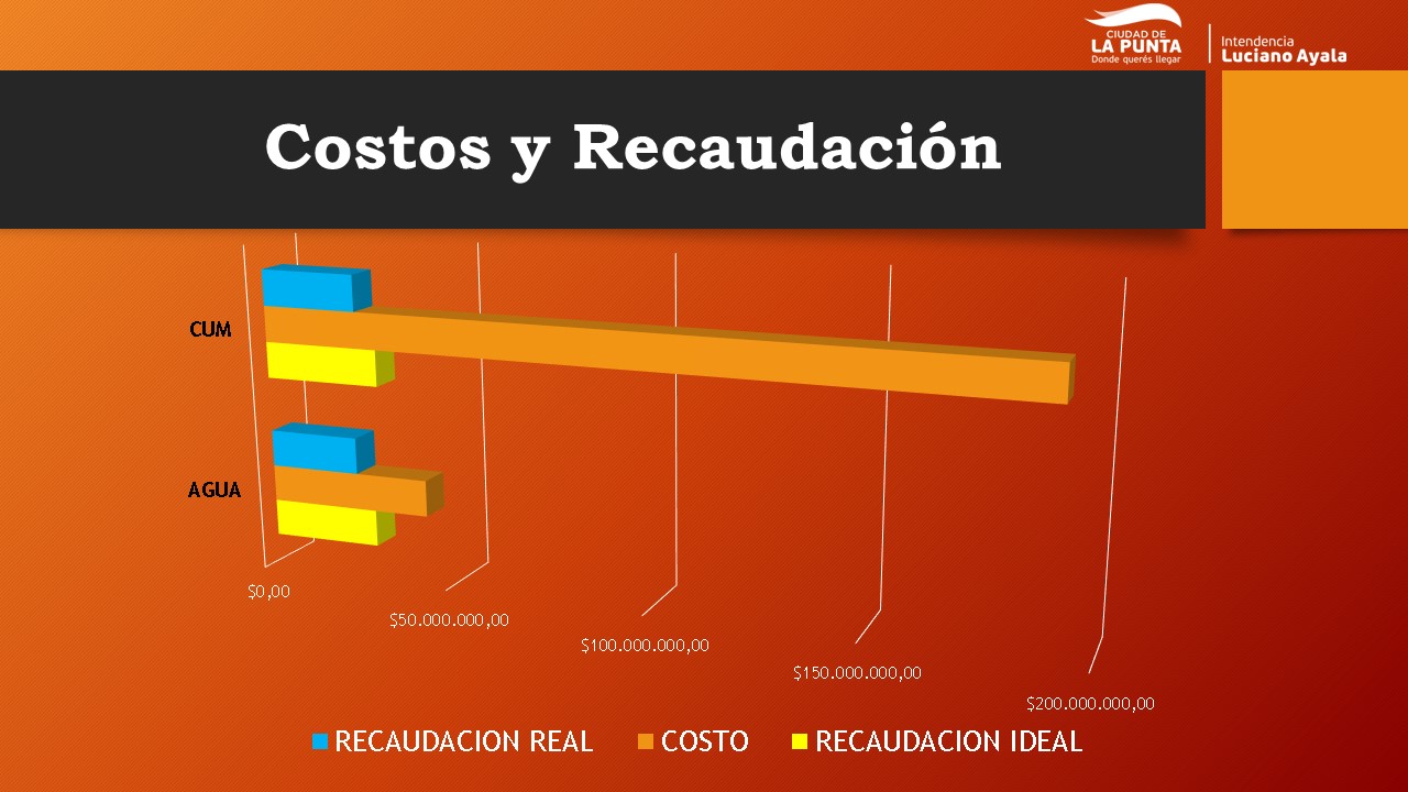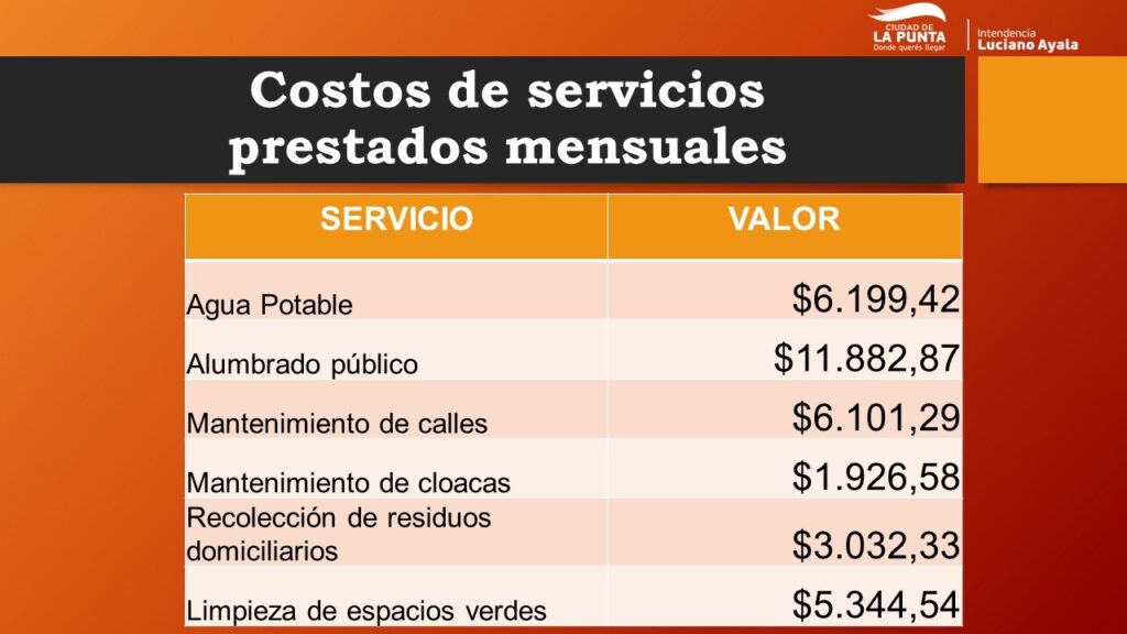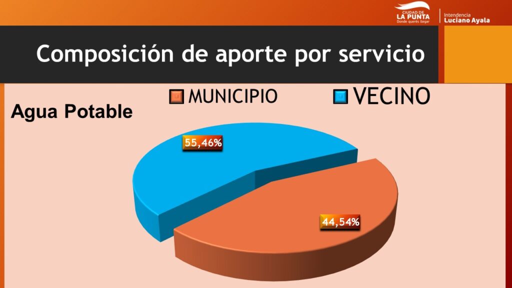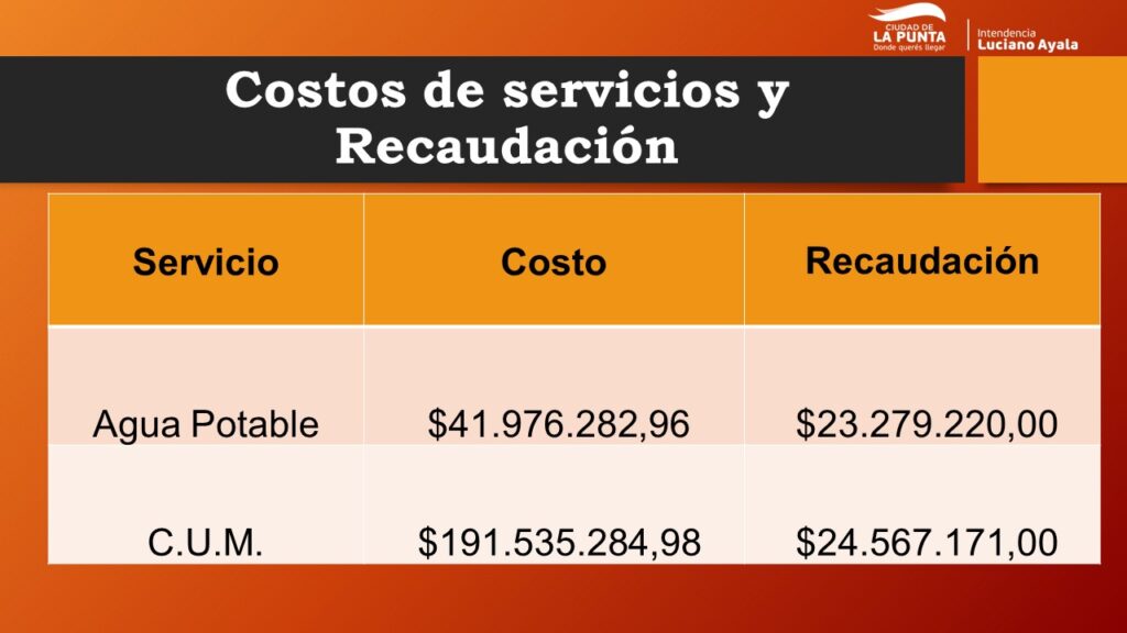 Según se desprende de un minucioso informe realizado por el municipio, actualmente, el costo de provisión de los servicios municipales es muy superior a la recaudación. Por ejemplo: el vecino abona en promedio mensual un valor de $4.140 pesos por el servicio de agua potable, en tanto que el costo de abastecimiento del mismo es de $6.199 por vivienda aproximadamente, es decir; que actualmente el vecino paga por un consumo de 25m3 de agua potable, el equivalente a casi el valor de 2 botellones de agua mensualmente.