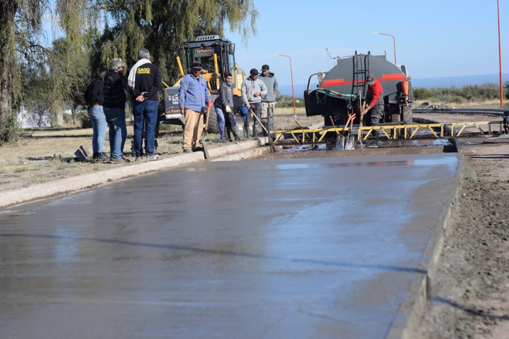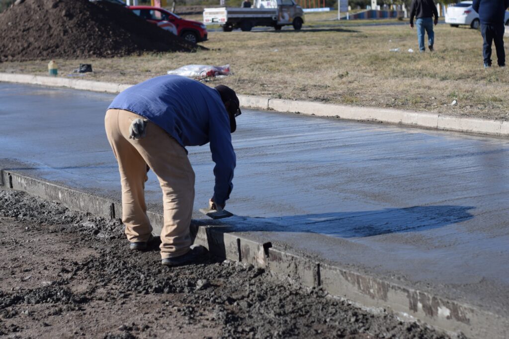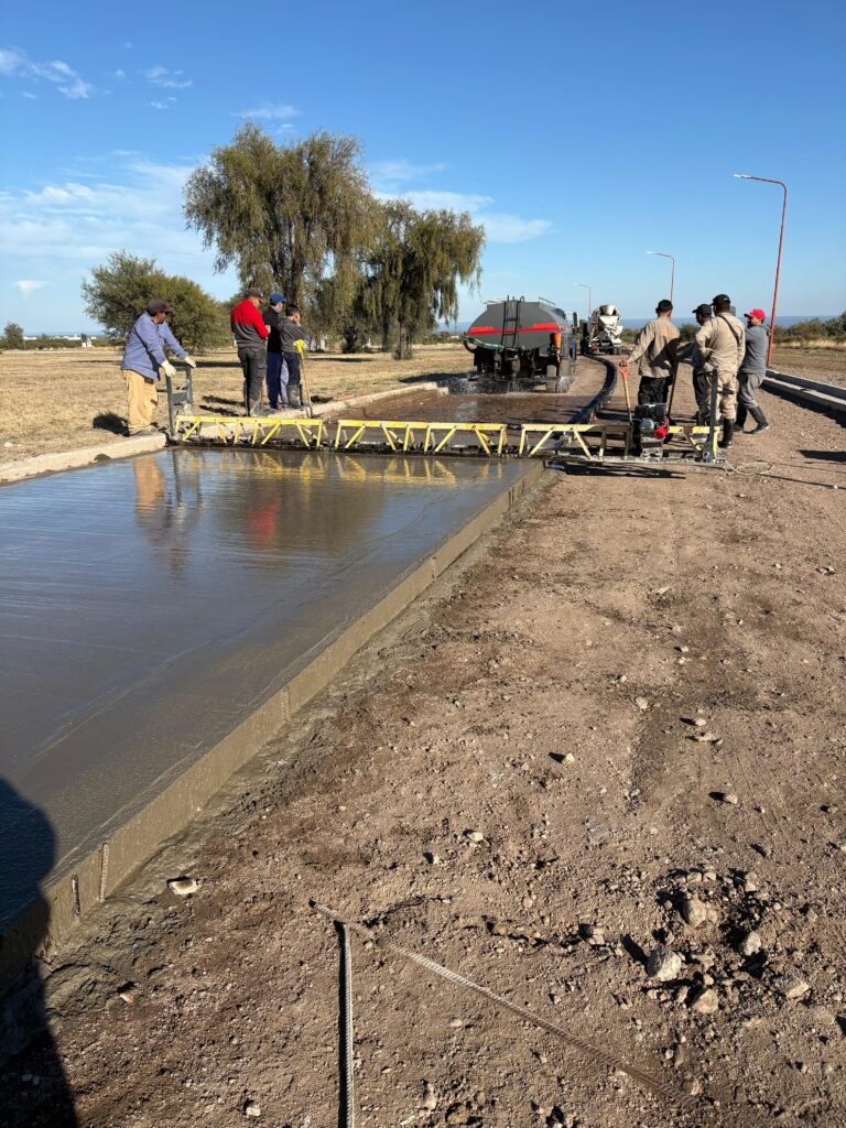 El cordón cuneta en la zona se completó la semana pasada, lo que permitió iniciar la pavimentación en el lado donde ya existe el cordón. Además, se están preparando cuidadosamente los puntos de inicio y finalización del hormigonado para la colocación de conectores que unirán los futuros paños. Estos conectores se fabrican con hierro del 16 y se insertan a 9 cm de profundidad en el hormigón (de 18 cm de espesor), asegurando la unión y estabilidad de cada sección pavimentada.