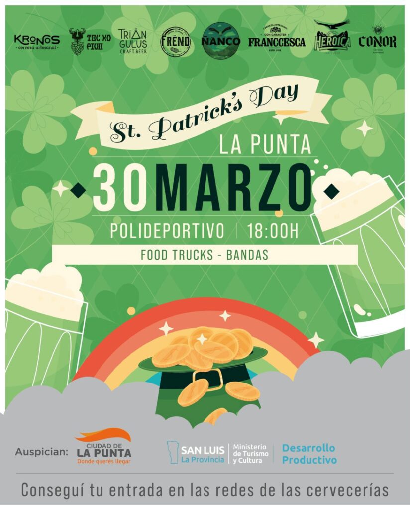 Los representantes del sector cervecero provincial ensamblarán el festejo de San Patricio (que fue el 17 de marzo) y el aniversario de la Ciudad de La Punta (26 de marzo) en un gran evento, que se celebrará el próximo sábado 30 de marzo en el Polideportivo Manuel García Ferré a partir de las 18:00hs.Habrá un patio de comidas, toro mecánico, y para fomentar la responsabilidad frente al volante, se sorteará un barril de cerveza entre los conductores designados para que puedan disfrutarlo en su cumpleaños. La Yugular, Los Manyines de Cuyo, Viejo Azar y los Pasioneros son las bandas musicales que le pondrán ritmo a la jornada.La entrada tiene un valor de $1.800 y un alimento no perecedero.Los organizadores de este festejo destacaron el acompañamiento de la Municipalidad de La Punta y del Ministerio de Desarrollo Productivo de la Provincia para contribuir en la creación de espacios donde los emprendedores pueden ofrecer sus productos.