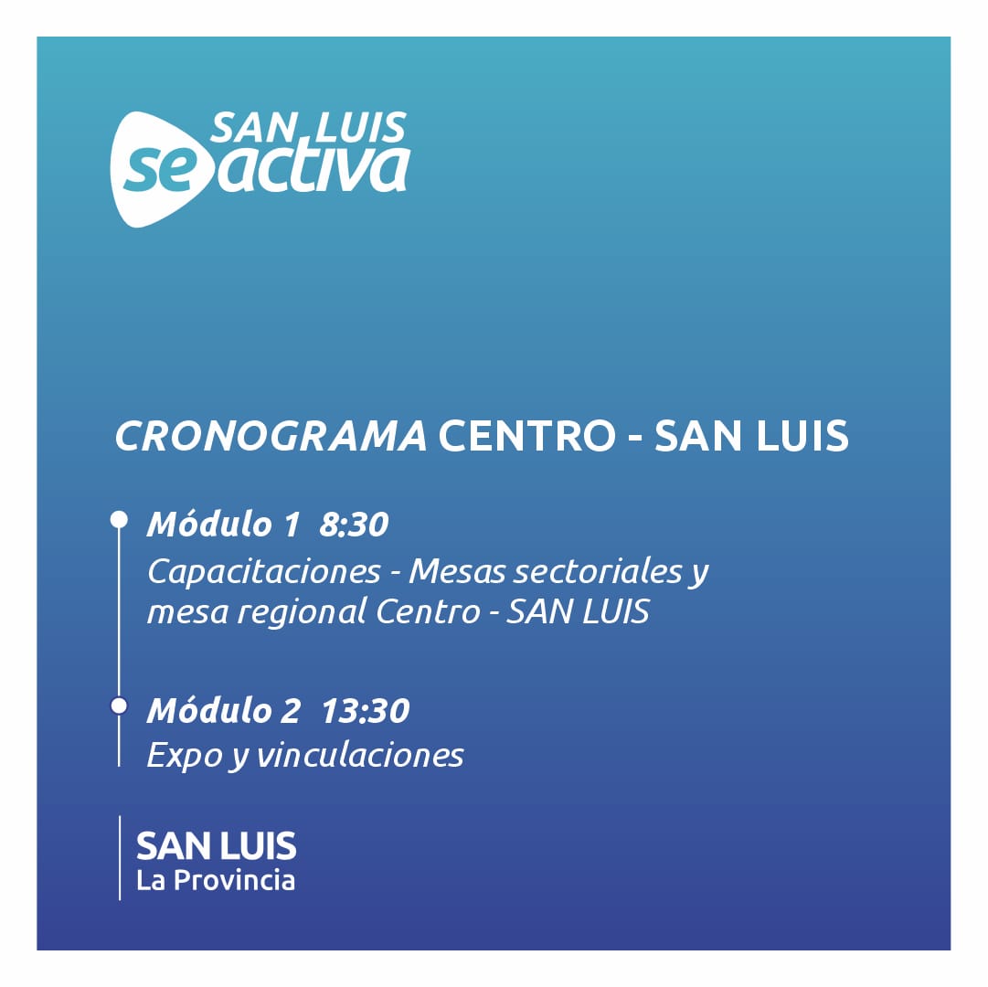 Habrá expo de productos y servicios, ronda de negocios, mesas de trabajo, capacitaciones y feria gastronómica regional. En esta oportunidad, se trabajara con representantes del sector privado de las localidades de Donovan, El Volcán, Estancia Grande, Juana Koslay, La Punta, Nogolí, Paso de las Carretas, Potrero de los Funes, San Luis, Villa de la Quebrada y Suyuque.